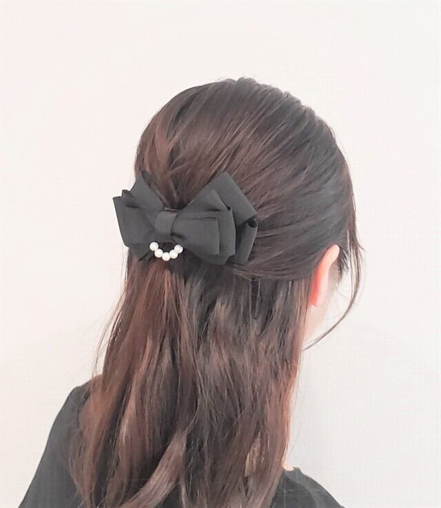 【大人用】高級国産リボンと淡水パールを使ったラグジュアリーなバレッタ(ブラック)