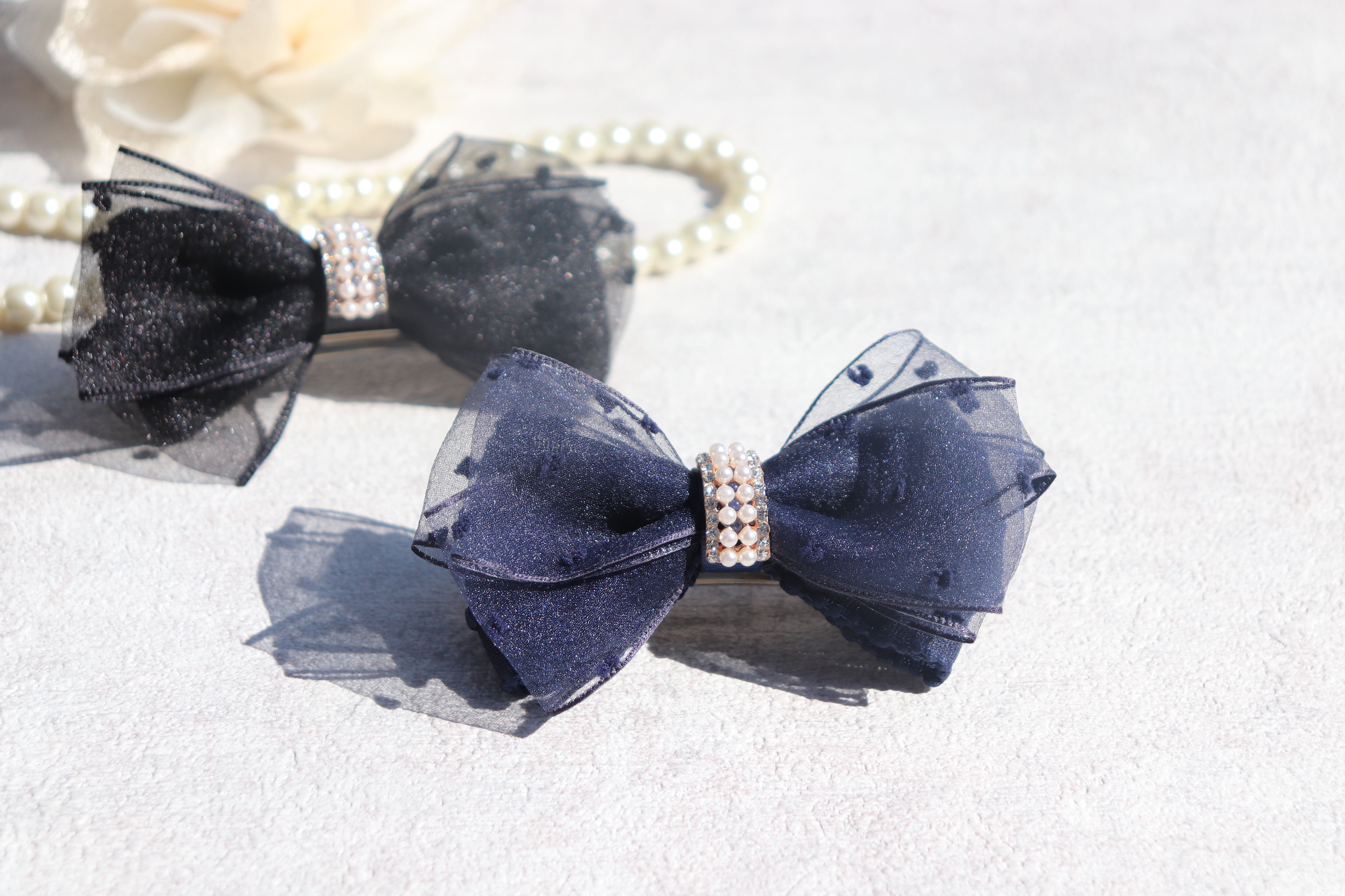 38㎜幅のドットオーガンジーリボンとメッシュ素材のリボンを組み合わせて、華やかにしました。